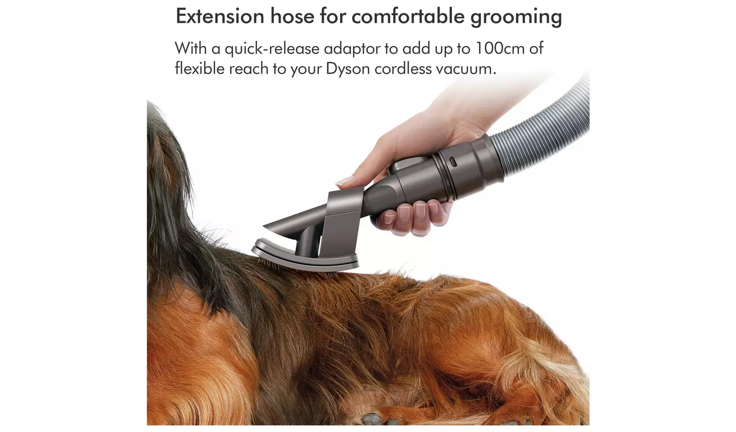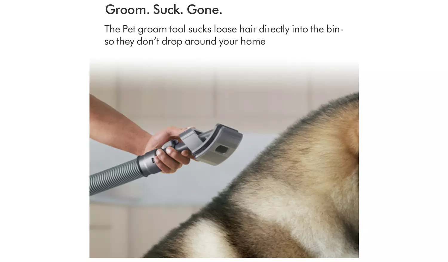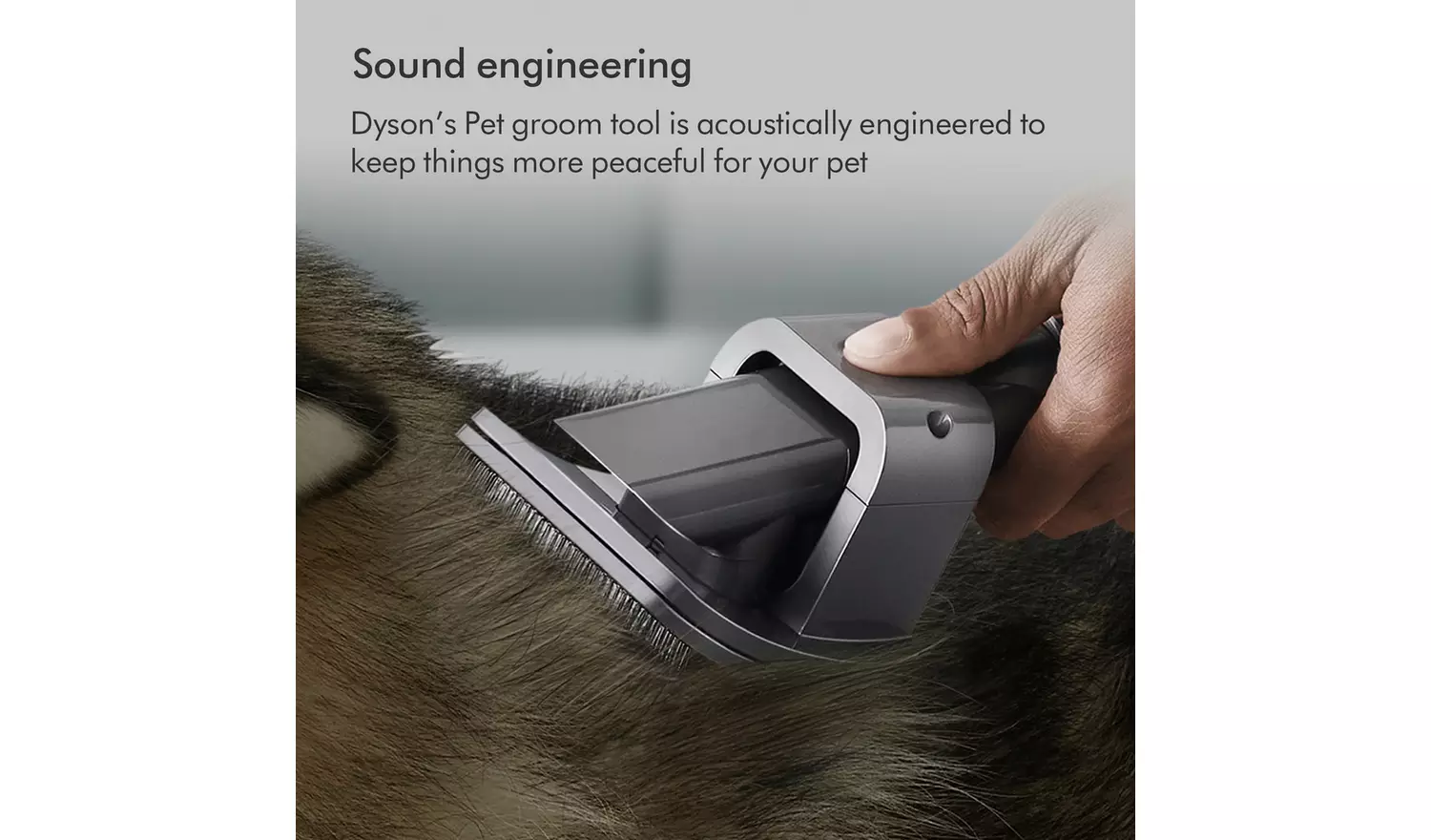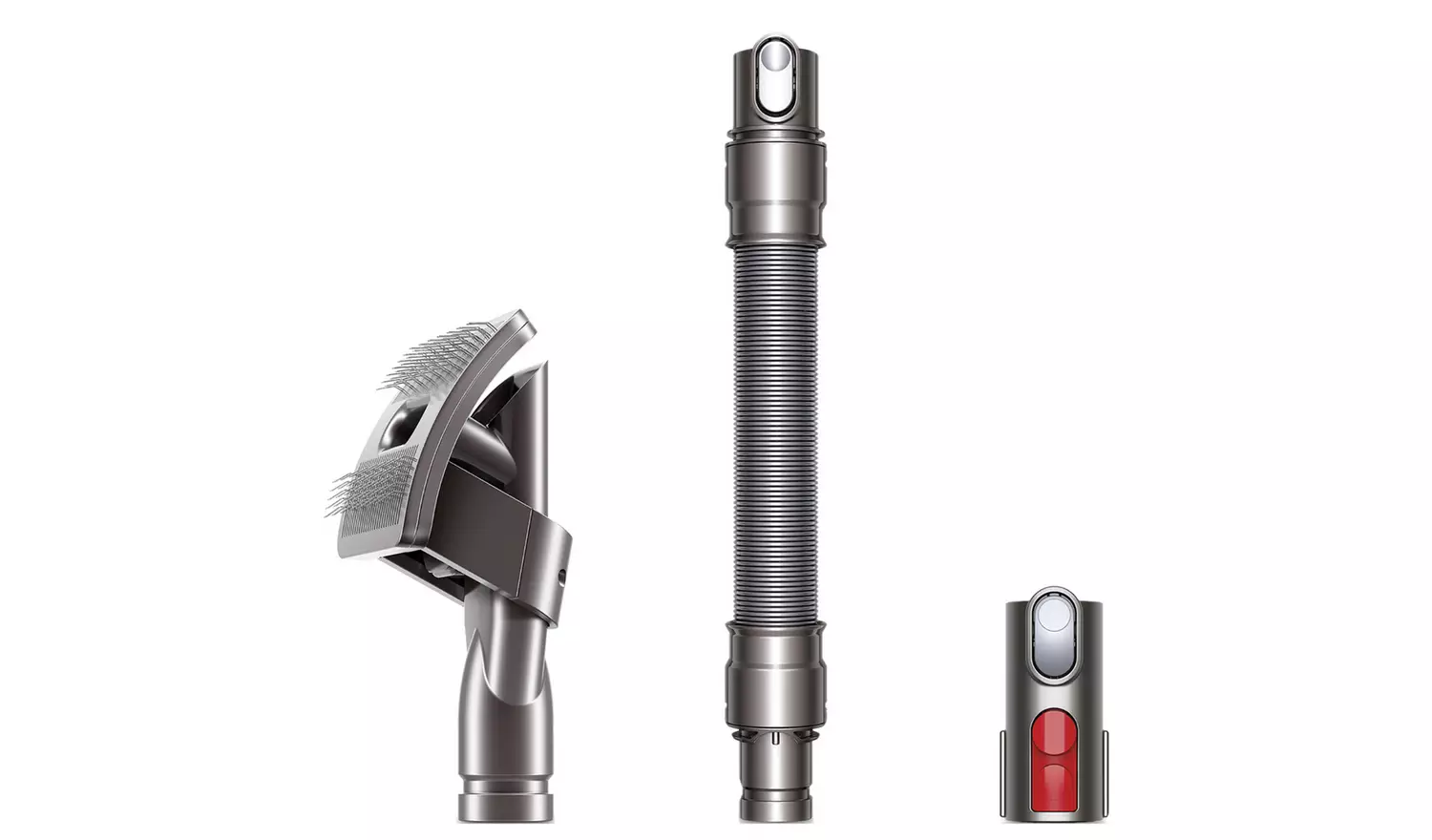 Dyson Pet Grooming Kit. Captures loose hair as you brush your pet. Flexible bristles self-clean in an instant. For medium and long-haired pets. The Dyson pet grooming kit includes three different accessories: the pet groom tool, extension hose and quick-release adaptor. Groom. Suck. Gone. The pet groom tool sucks loose hair directly into the bin – so they don’t drop around your home. Sound engineering. Dyson’s pet groom tool is acoustically engineered to keep things more peaceful for your pet.