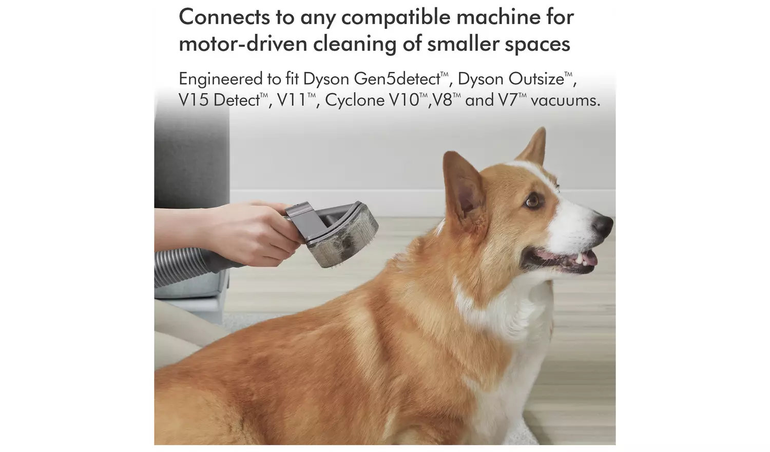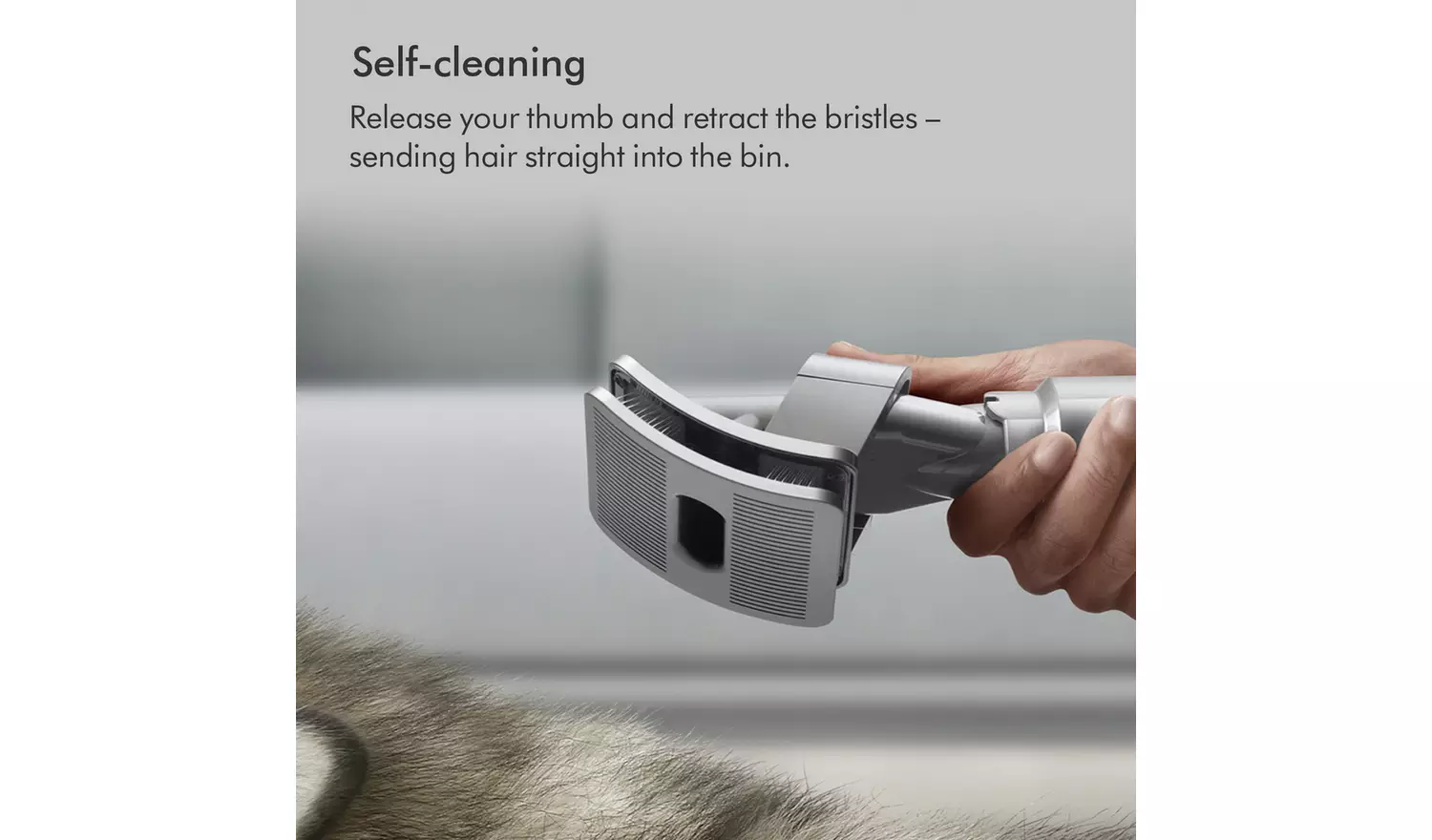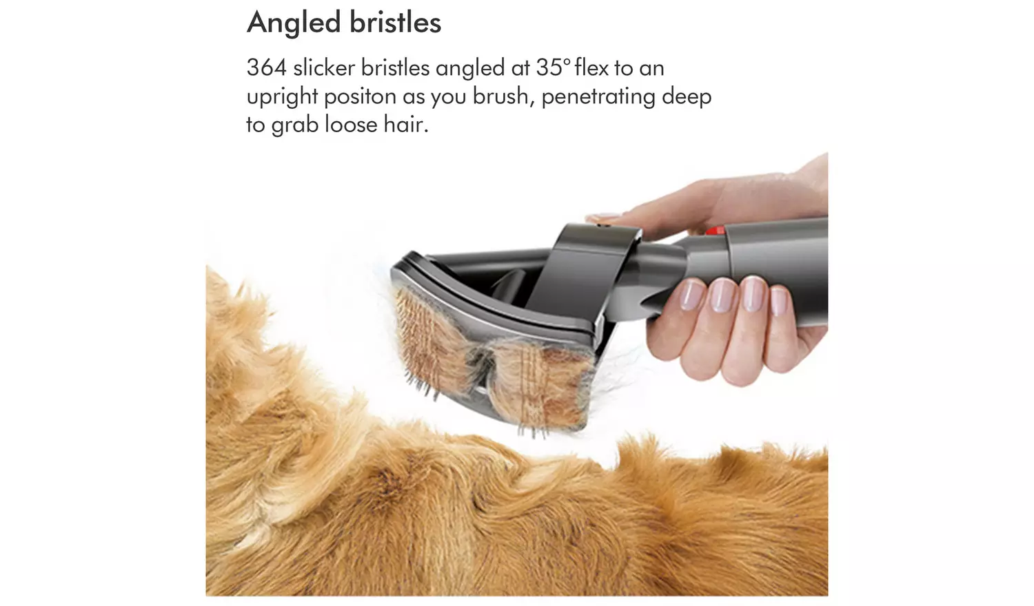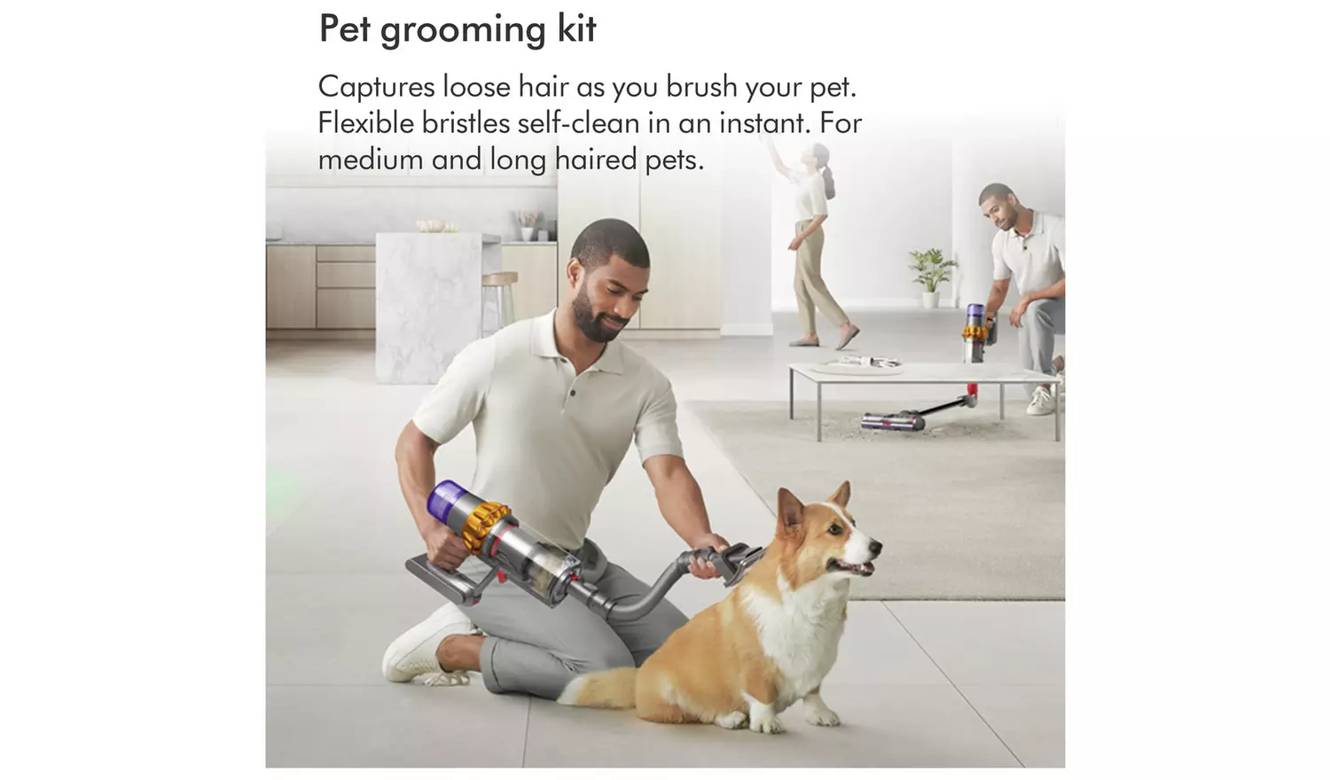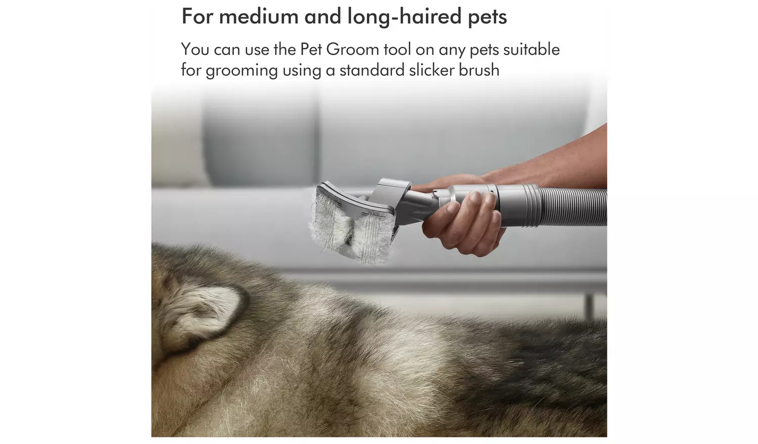 Dyson Pet Grooming Kit. Captures loose hair as you brush your pet. Flexible bristles self-clean in an instant. For medium and long-haired pets. The Dyson pet grooming kit includes three different accessories: the pet groom tool, extension hose and quick-release adaptor. Groom. Suck. Gone. The pet groom tool sucks loose hair directly into the bin – so they don’t drop around your home. Sound engineering. Dyson’s pet groom tool is acoustically engineered to keep things more peaceful for your pet.